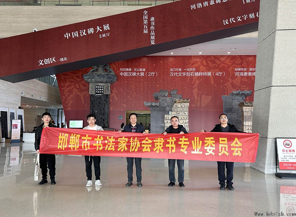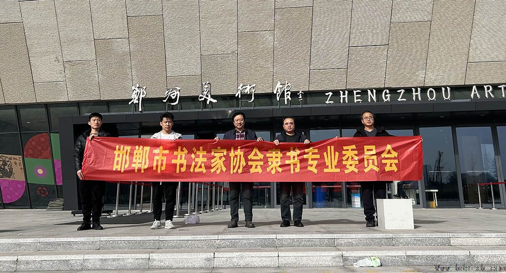 11月9日,邯郸市书法家协会副主席、隶书专业委员会主任关建洲、杜春林,组织邯郸书协隶书专业委员会委员,前往郑州美术馆观摩学习全国第五届隶书作品展览。参加此次活动的还有市书协隶书专业委员会副主任魏丽丽,副主任兼秘书长李铎,以及委员杨浩乾、牛保东。此次活动旨在提升隶书专业委员会学术水平和创作能力。
