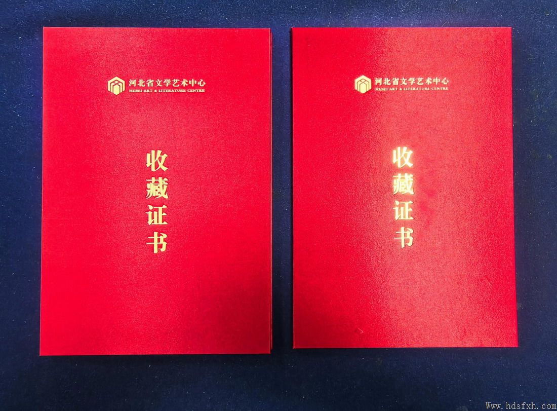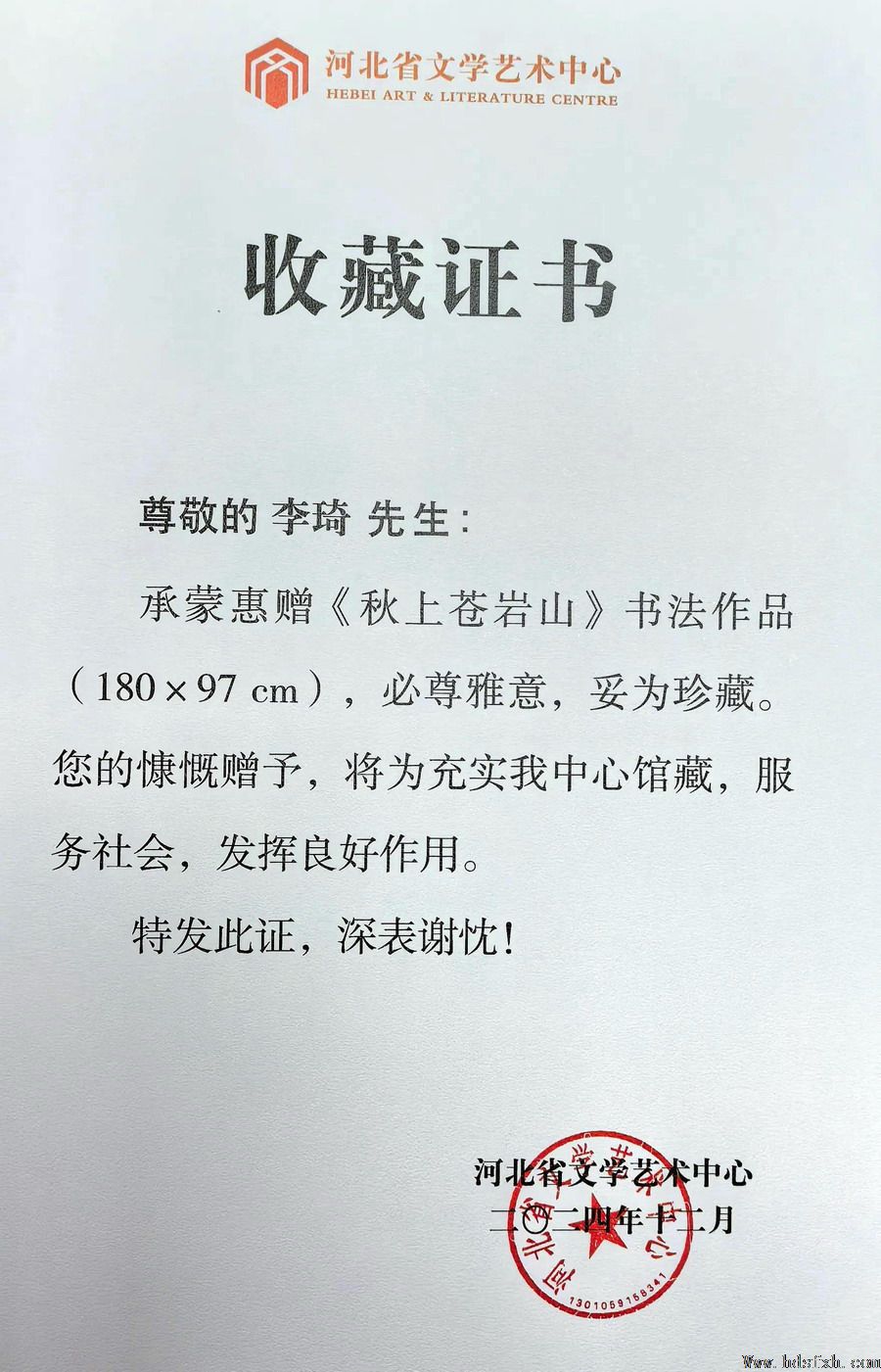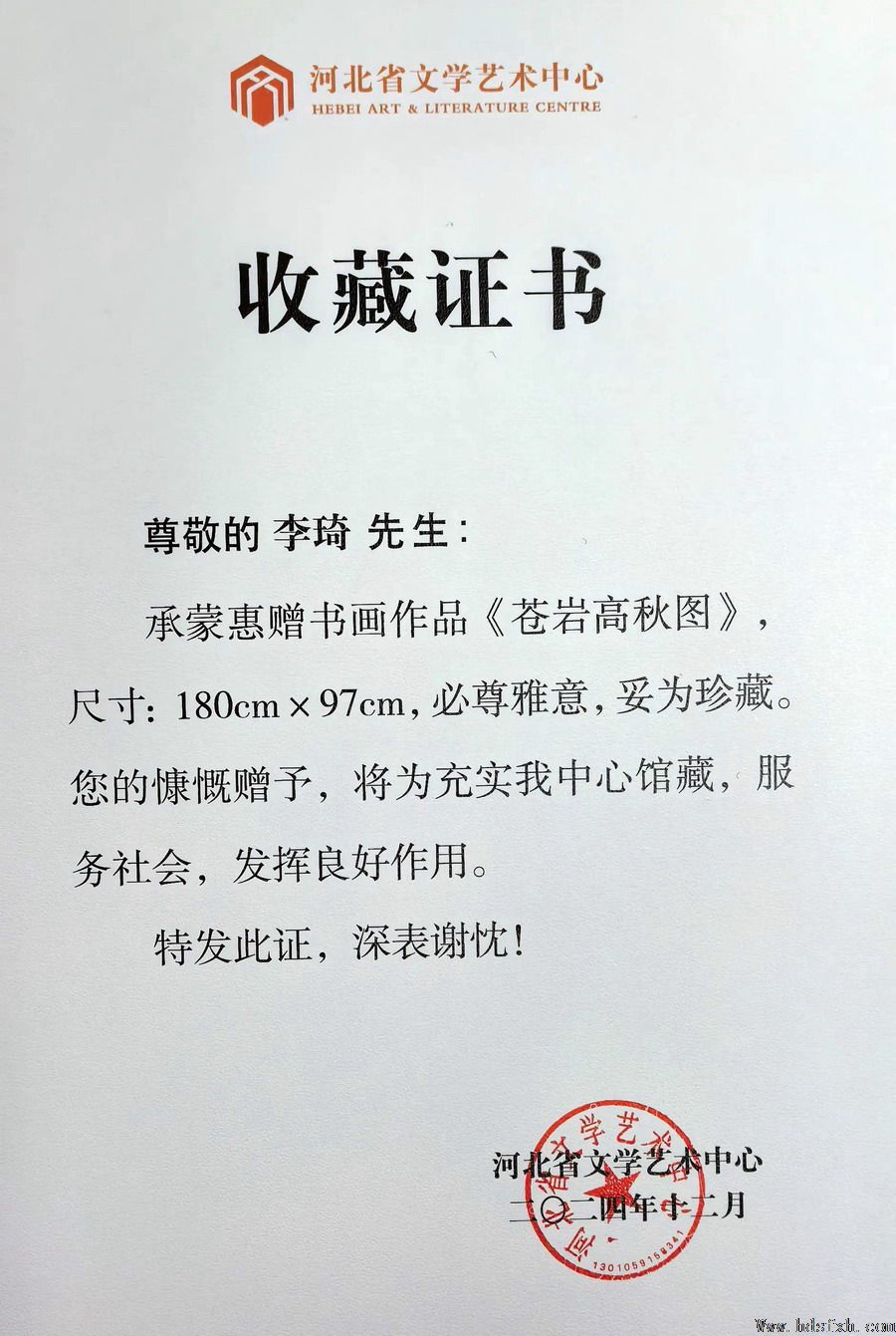 2025年10月29日,邯郸市著名艺术家李琦先生收到河北省文学艺术中心颁发的两份“收藏证书”,对其向该中心捐赠国画作品《苍岩高秋图》(180x97cm)和书法作品《秋上苍岩山》(180x97cm),表示感谢。